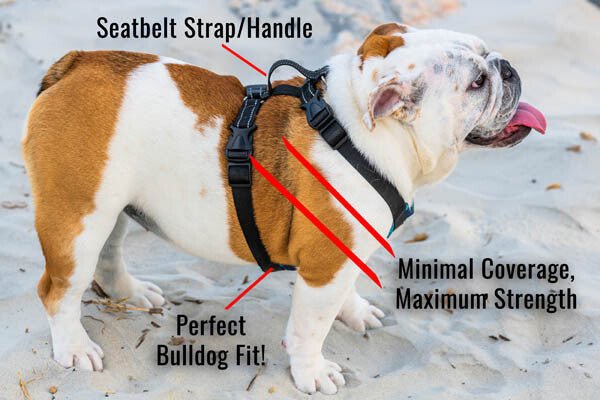 Custom-made for Bulldogs of all shapes and sizes. Lightweight, durable, and easy to put on and take off. Keeps your Bulldog secure without choking or overheating.