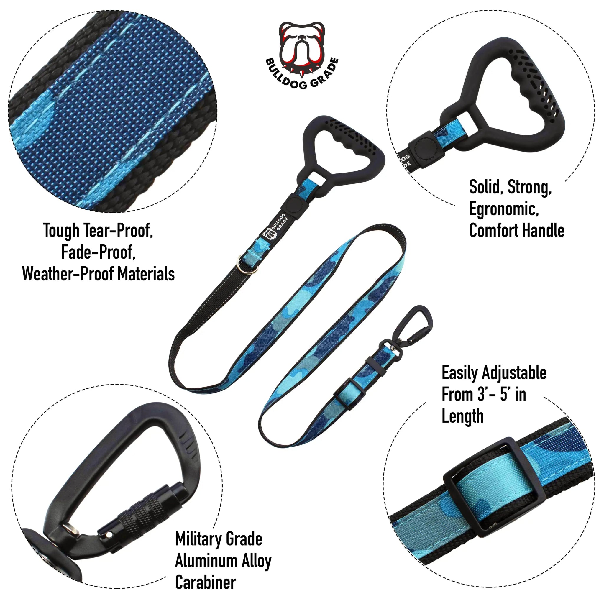 Built strong enough for Bulldogs with a military-grade carabiner and tear-proof materials. Features an ergonomic rubber handle for your comfort. Fully adjustable from 3 ft. to 5 ft., and perfectly color-matched to your harness.